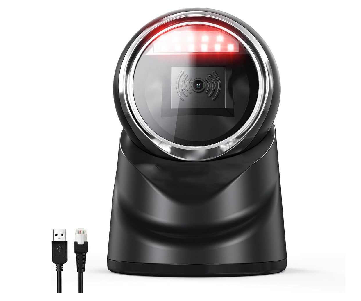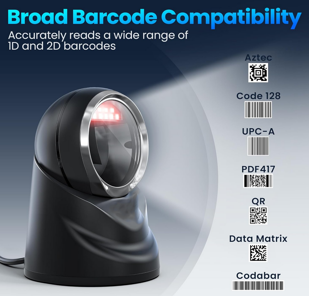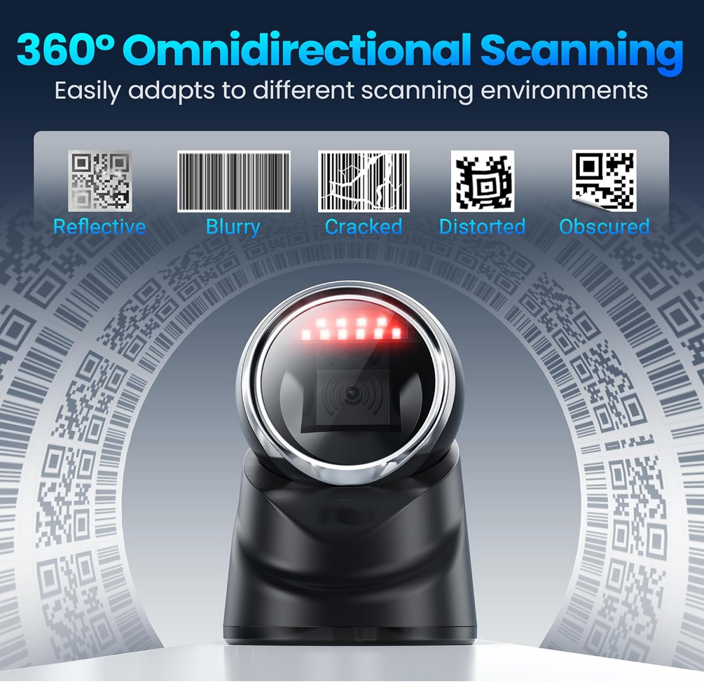 Der Standbarcodescanner scannt automatisch, sobald ein Barcode erkannt wird. Er schaltet sich mittels Bewegungsmelder ein und scannt mit 20 Laserlinien auf einmal. Der Scanner ist Plug & Play fähig, funktioniert jedoch nur in Kombination mit einem USB-fähigen Gerät (Computer, Laptop, …).